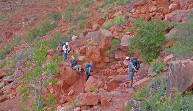 Our Grand Canyon backpacking guides will take you down the Hermit Trail where you will experience solitude at its finest. This more arduous journey will take us 8 miles into the canyon past the exquisite Santa Maria Spring and down the Cathedral Stairs to the Hermit Campground on Hermit Creek. This spring fed creek oasis hosts crystal clear swimming holes and lush vegetation.