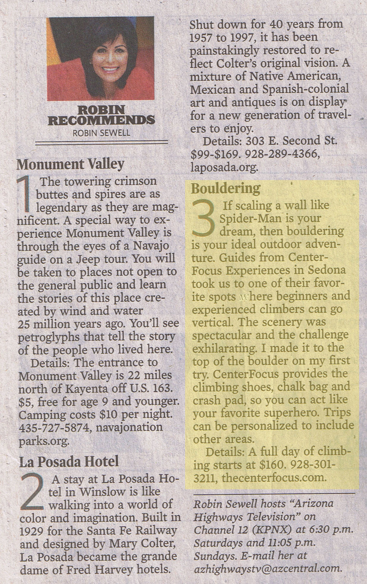 The Arizona Republic - An article that was written about CenterFocus by Robin Sewell which complimented the Arizona Highways Television feature on bouldering. Click on the logo to read the article.![]() |